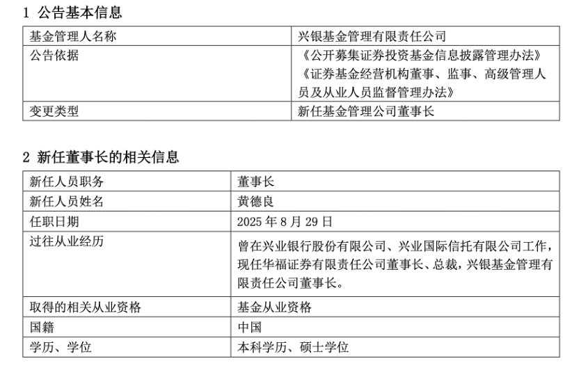 直到8月30日,兴银基金迎来接棒者——黄德良。