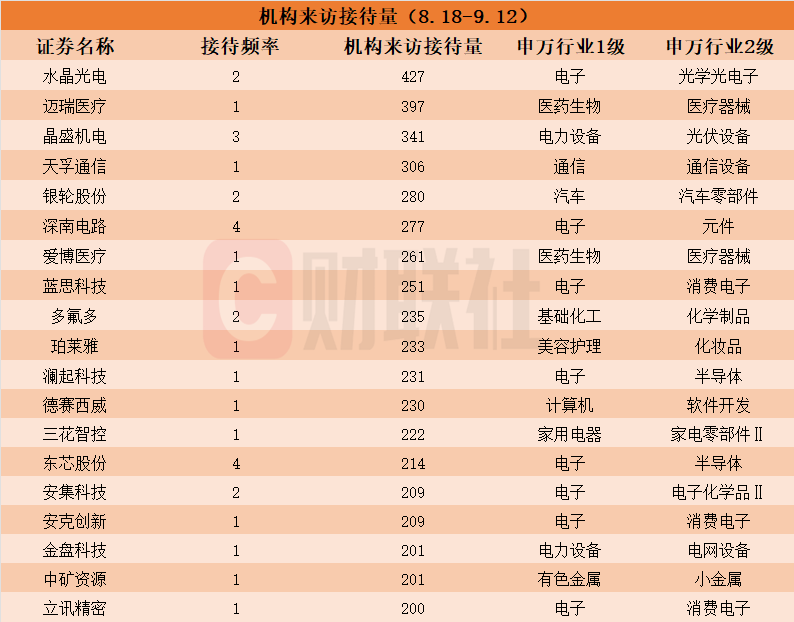 据Choice数据显示,截至发稿,近一个月(8.18-9.12)包括水晶光电、迈瑞医疗、晶盛机电、天孚通信、银轮股份、深南电路、爱博医疗、蓝思科技、多氟多、珀莱雅、澜起科技、德赛西威、三花智控、东芯股份、安集科技、安克创新、金盘科技、中矿资源、立讯精密在内的19家上市公司机构来访接待量超200家,具体情况见下图: