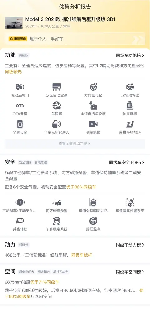 这辆Model 3在配置上不乏亮点。首先,它配备了L2辅助驾驶功能,这在同级别车型中处于领先地位。此外,全速自适应巡航、分段式不可开启全景天窗、全车无钥匙进入和启动、方向盘记忆以及OTA升级等配置,都展现了特斯拉在科技感和实用性方面的出色表现。
