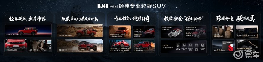 北京越野董事长王昊表示,BJ40作为中国越野的领路者,亲历过无数盛事荣耀,也成为中国汽车的独特文化符号,在全球用户的认可中走入了万千家庭。BJ40以探险家的名义,开启全新征程,在经典设计、自由改装、专业性能、极致安全和跨圈舒适五大维度再造新经典,为中国越野车市场再造经典专业越野SUV。
