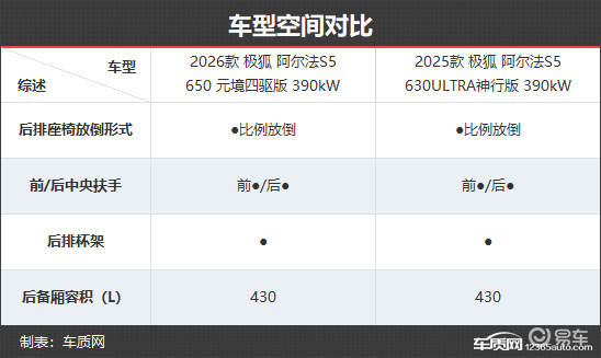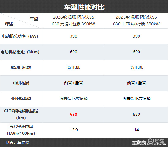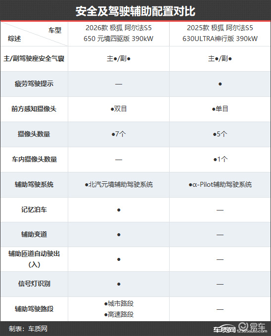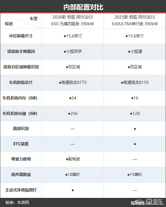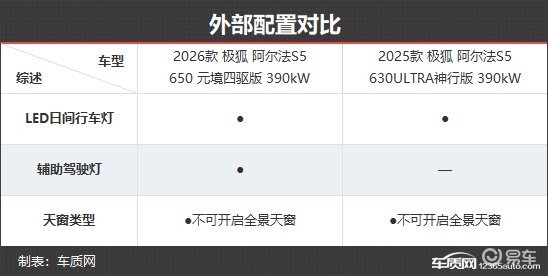 2026款极狐阿尔法S5共推出7款配置,相较2025款车型,虽然配置选择变少,但是价格区间有所下调,性价比更高。动力方面,新款车型在保留纯电版本的基础上,还提供了增程版本可选。本次选择对比的车型均为售价最高的顶配版本,以便能够更加直观地看出两者在配置层面的具体差异。