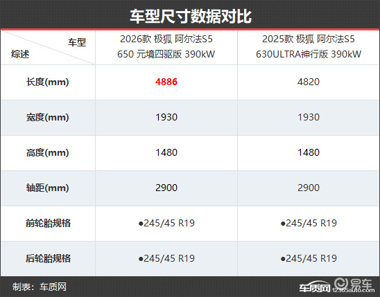尺寸方面,新款极狐阿尔法S5相较老款车型仅在车身长度上增加了66mm,视觉观感难以察觉。结合外观细节设计不难判断,这部分差异主要还是由于新老两款车型的前后包围造型有所区别,并非核心架构改变。至于车身宽度、高度、轴距以及轮胎规格,两者则完全保持一致。