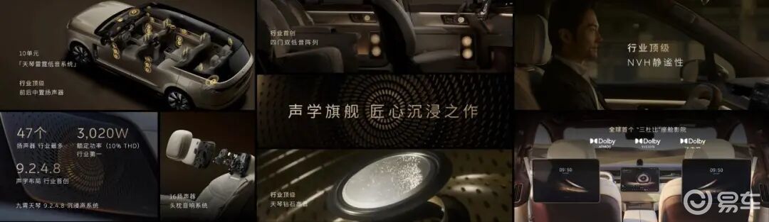音响方面搭载九霄天琴9.2.4.8沉浸声系统,拥有47个扬声器、3020W额定功率,高音单元创新采用100%纯钻石打造的高音振膜,全车通过了杜比全景声、杜比视界及杜比动态视频增强三项认证。