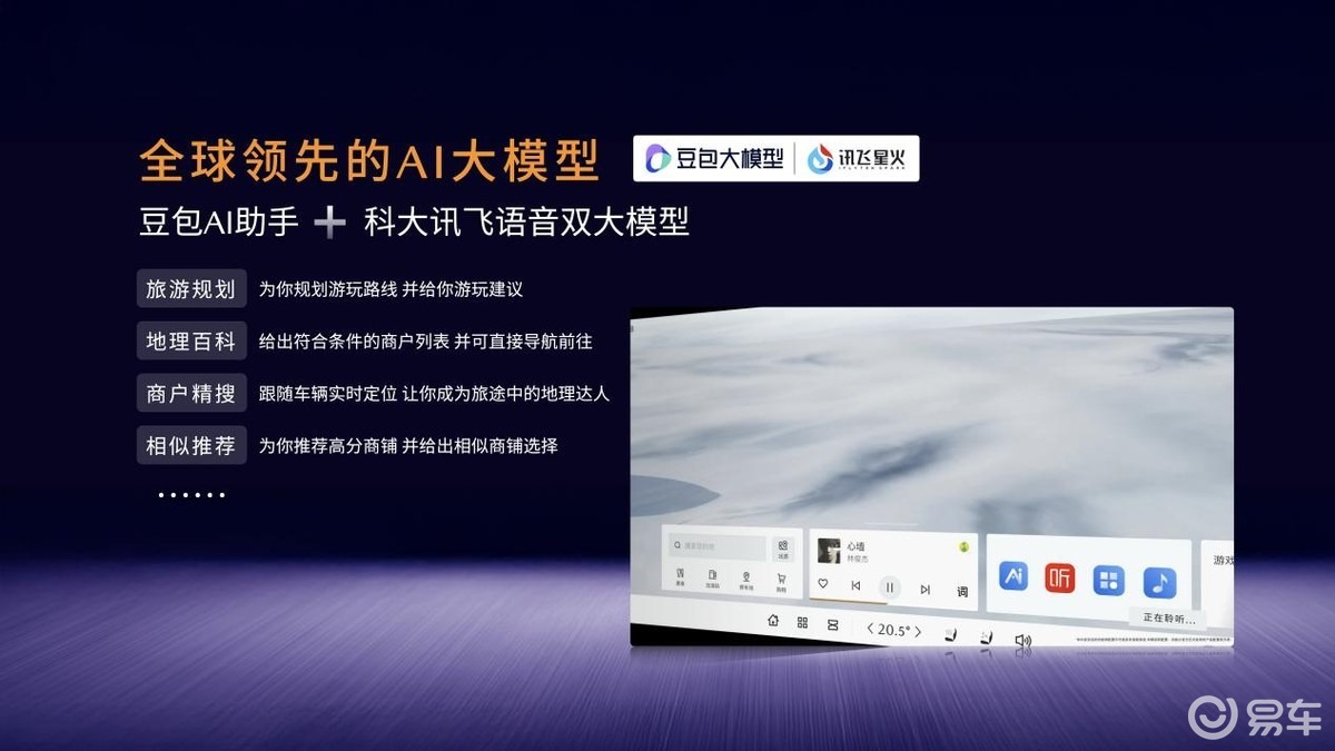 智舱平台内置豆包和讯飞星火两个AI大模型,不管是导航、控车,还是陪玩聊天,样样在行。豆包AI助手堪称一名称职的“随行生活顾问”,你的需要都能精准匹配解决方案。讯飞星火AI,则把人机交互体验做到了最好。主驾驶位采用“多模识别”技术,包含唇形检测+声源定位+音区锁定三大技术,即使车里放着音乐,也能精准识别你的指令。智能管家全时免唤醒,直接说指令,它就会立刻执行。