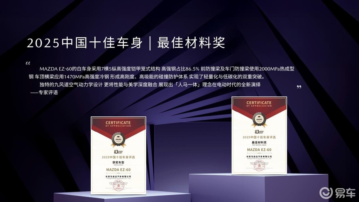 安全是马自达刻在骨子里的DNA,是所有驾乘愉悦的前提。EZ-60通过“实战测试+权威认证”双维度,树立了新能源中型SUV安全领域的新标杆,为用户的每一次出行保驾护航。9月,EZ-60在“勇士之路”丙察察成功完成行业首个“整车碰撞/翻滚/浸水”连环挑战,并荣获中汽中心颁发的“TOP Safety”顶级安全证书,展现出卓越的安全性能。同月再次斩获“2025中国十佳车身”及“最佳材料奖”两项大奖。
