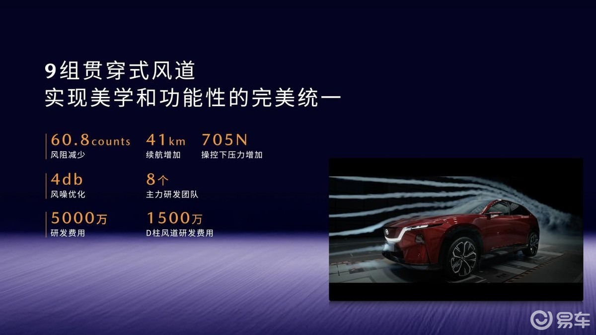 同级首创的9组贯穿式风道与7组空气动力学组件,让EZ-60在行驶过程中减少风阻60.8 counts,CLTC续航提升41km,长途出行时节能效果显著;在高速行驶时,后轴可获得最高705N的稳定下压力,大幅提升行驶稳定性;同时,多风道的设计,有效梳理车身表面乱流,让风噪优化4dB(A),车内环境更加静谧,为用户营造舒适的驾乘空间。