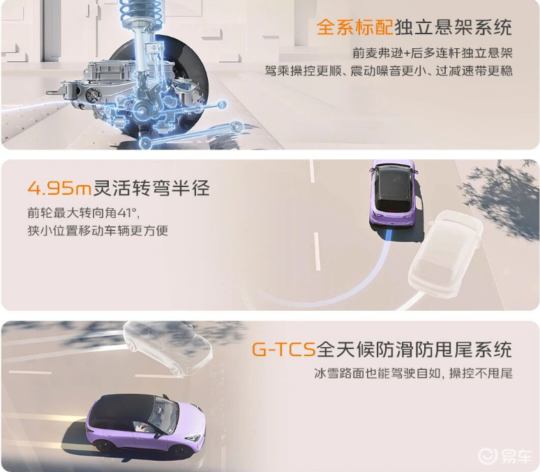 背后得益于,全系标配前麦弗逊独立悬架,后多连杆独立悬架,以及G-TCS全天候防滑防甩尾系统,可以基于地面附着系数,控制电驱扭矩输出,降低车轮打滑量,保持最佳路面附着力,减少车身横向晃动,保障行驶安全。
