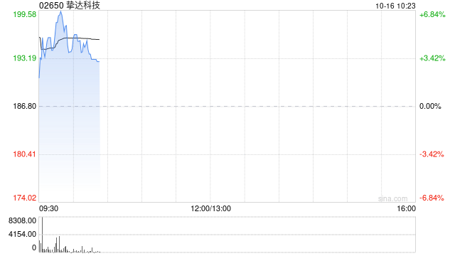 挚达科技(02650)盘中涨超6%,截至发稿,股价上涨3.37%,现报193.10港元,成交额924.83万港元。