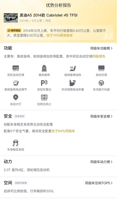 综上所述,这辆二手奥迪A5 Cabriolet在各方面都有着不错的表现。其时尚的外观设计、出色的驾驶性能、豪华的内饰配置以及合理的空间布局,都使得它成为了一款值得考虑的车型。当然,在购买二手车时,我们也需要关注车辆的具体状况、维修记录等因素。对于这辆车的具体车况,由于没有看到实车检测报告,所以无法为您详细解读,不过您可以随时查看懂车帝平台上的专业检测报告,来更全面地了解车况。