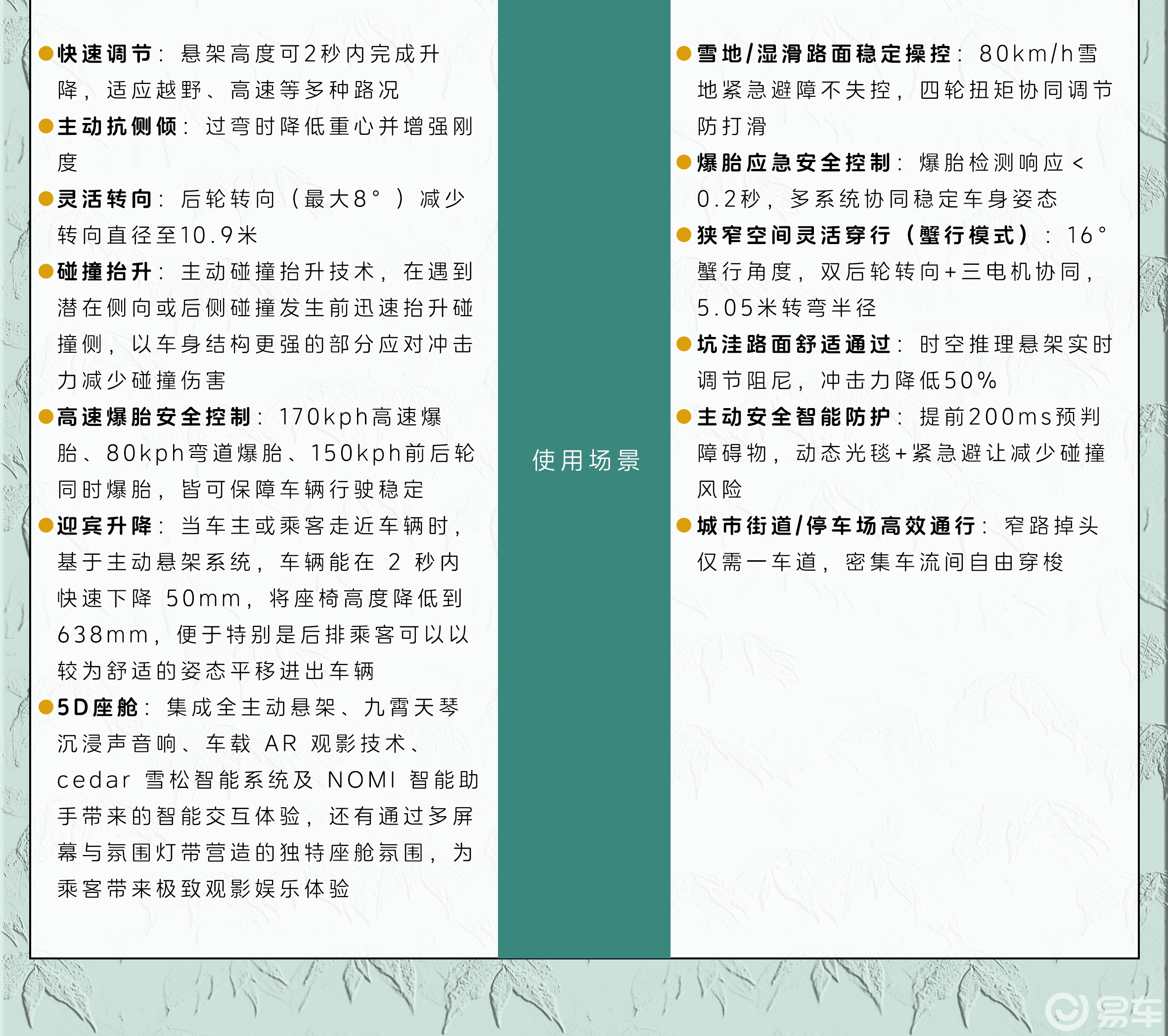 安全冗余是衡量顶级底盘的关键标尺。蔚来ET9展现了极致的工程安全思维:其线控转向系统具备执行、通信、供电、计算四重冗余;在爆胎场景下,能实现170km/h高速爆胎、80km/h弯道爆胎,甚至150km/h前后轮同时爆胎的稳定控制,爆胎检测响应时间低于0.2秒。此外,碰撞抬升技术能在碰撞发生前200ms主动抬升车身,以结构更强处应对冲击,将被动安全延伸至主动防御。