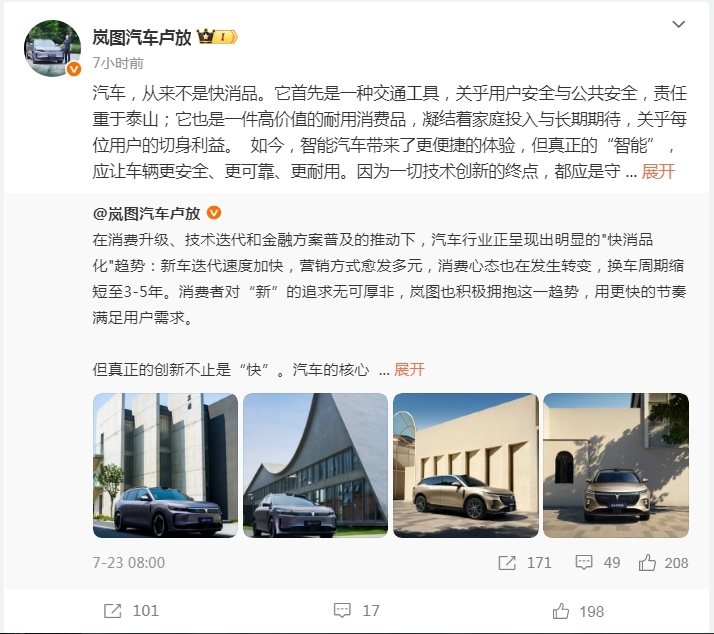凤凰网科技讯 10月15日,岚图汽车科技股份有限公司董事长、总经理卢放分享观点:“汽车,从来不是快消品。它首先是一种交通工具,关乎用户安全与公共安全;它也是一件高价值的耐用消费品,关乎每位用户的切身利益。如今,智能汽车带来了更便捷的体验,但真正的“智能”,应让车辆更安全、更可靠、更耐用。我们不应本末倒置,更不应被追逐新潮、快速迭代的电子快消思维带偏方向。” 卢放曾在今年7月发表过类似的观点,称在消费升级、技术迭代和金融方案普及的推动下,汽车行业正呈现出明显的“快消品化”趋势:新车迭代速度加快,营销方式愈发多元,消费心态也在发生转变,换车周期缩短至3-5年。消费者对“新”的追求无可厚非,岚图也…